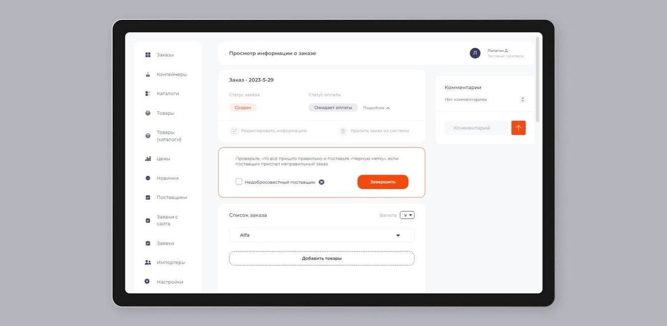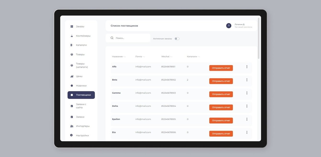 Наша основная задача от клиента – разработка системы, которая позволит управлять заказами, то есть взаимодействием с поставщиками и китайскими партнёрами.
