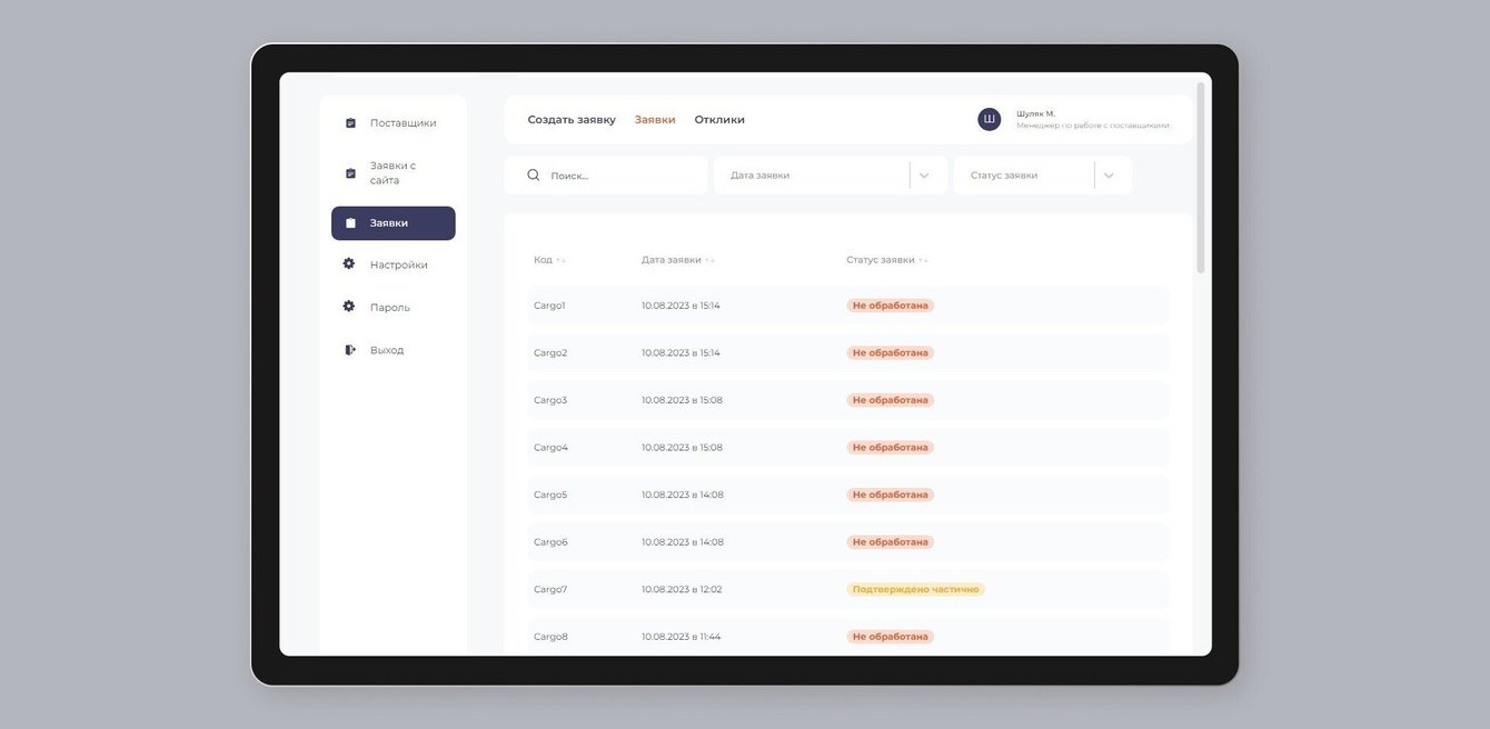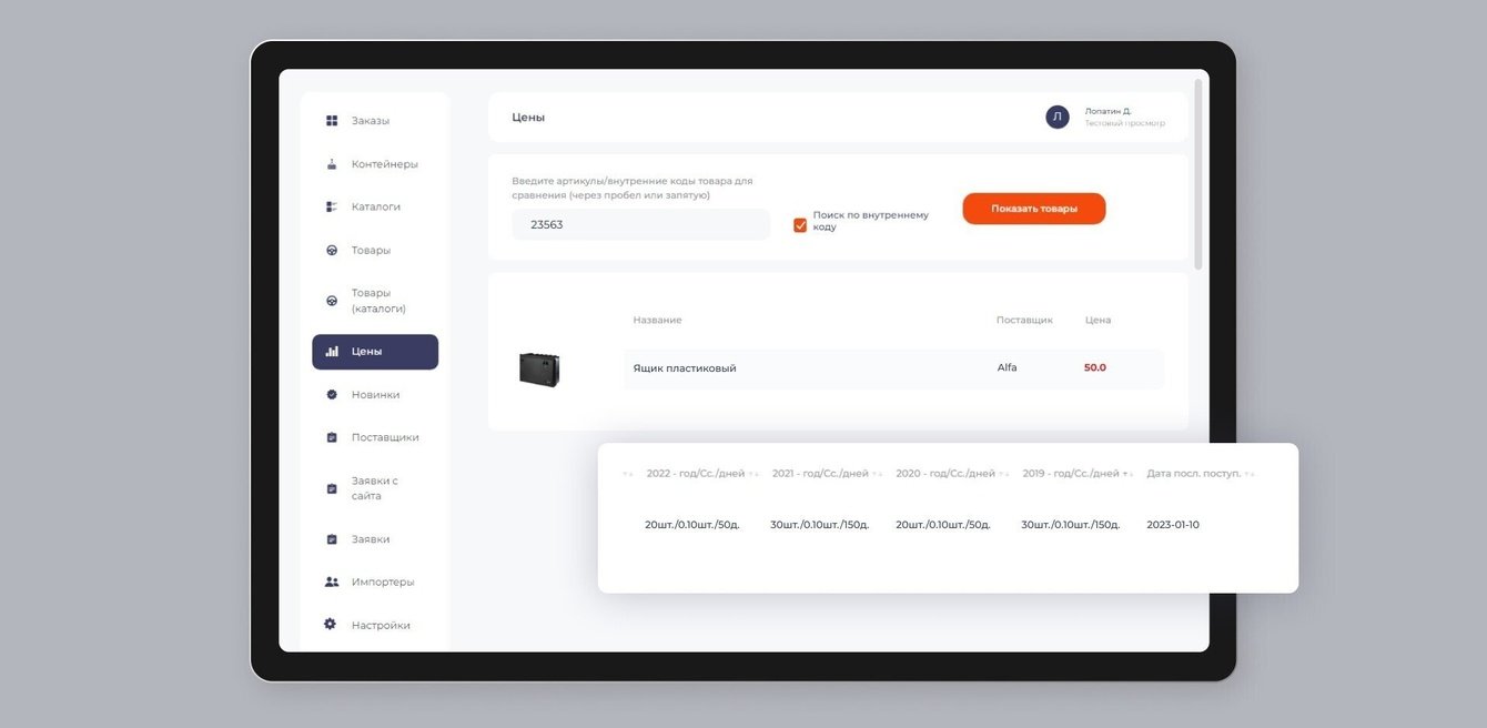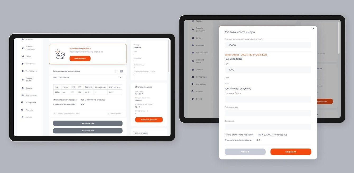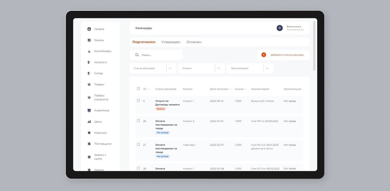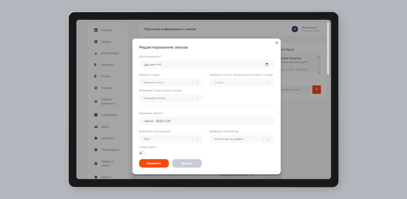 Система позволяет работать с поставками — управлять статусами заказов для поставщиков и статусами оплаты, выбирать дату прибытия заказа, город, поставщика и контейнер.