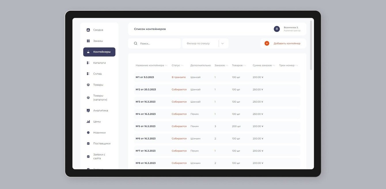 Оформляется поставка через модуль Контейнеры. Контейнеры можно искать по номерам, фильтровать по статусу и сортировать по номеру контейнера, количеству заказов и товаров, сумме заказа и трек-номеру. Внутри контейнера есть список заказов.