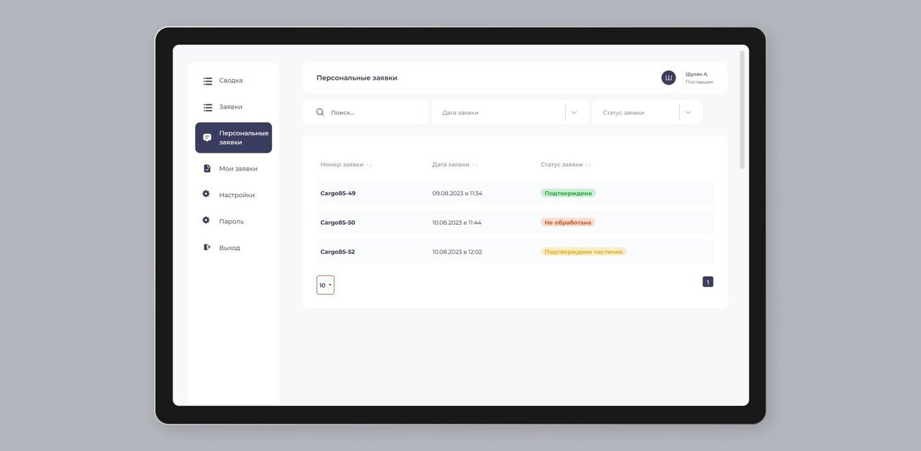 В ЛК Поставщика отображаются заявки от покупателей. Есть фильтры по категориям товара, количеству, срокам приема. Также заявку можно находить по наименованию или артикулу товара.