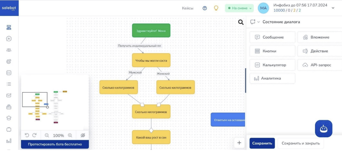 Telegram-бот (на базе Salebot) — сбор параметров клиентов, выдача рекомендаций, взаимодействие после обращения