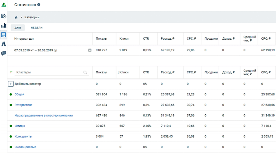 После этого создали кластеры рекламных кампаний, объединив их по сегментам, например, по поиску и РСЯ. Проанализировали сегментированную статистику, в частности, сегменты Яндекс.Директа в разрезе рекламных кампаний, площадок и ключевых запросов.