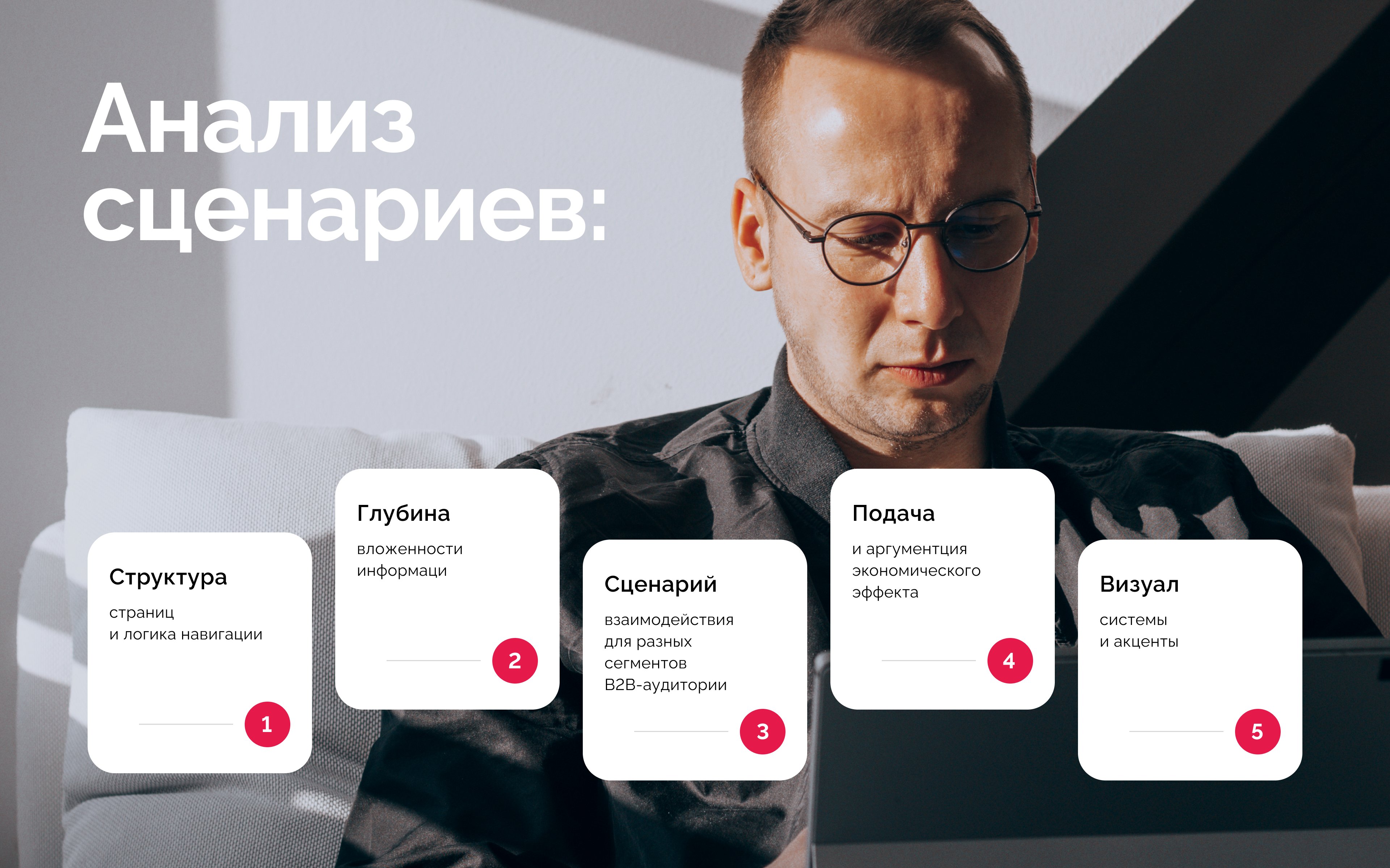 В рамках аудита мы изучили структуру страниц, логику навигации, глубину вложенности информации и последовательность раскрытия продукта. Дополнительно проанализировали аргументацию экономического эффекта и расположение ключевых блоков.