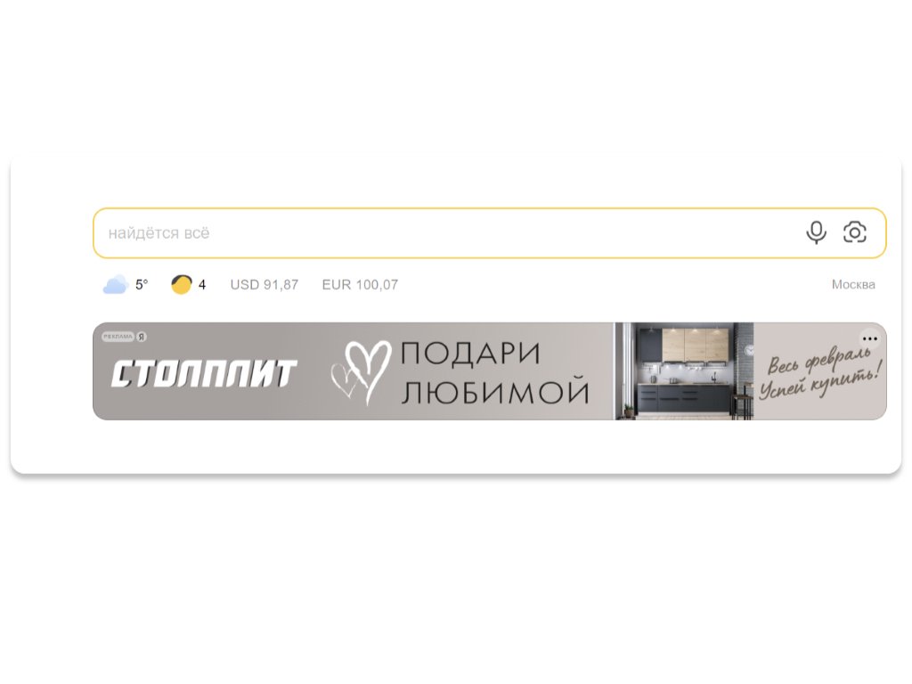 Для решения задачи выбрали Баннер под поисковой строкой. Этот формат позволяет охватить большой процент аудитории, где рекламу заметит почти каждый. Такой баннер размещается в полной и мобильной версии Яндекс Браузера, а ещё на новой вкладке браузера для десктопов.