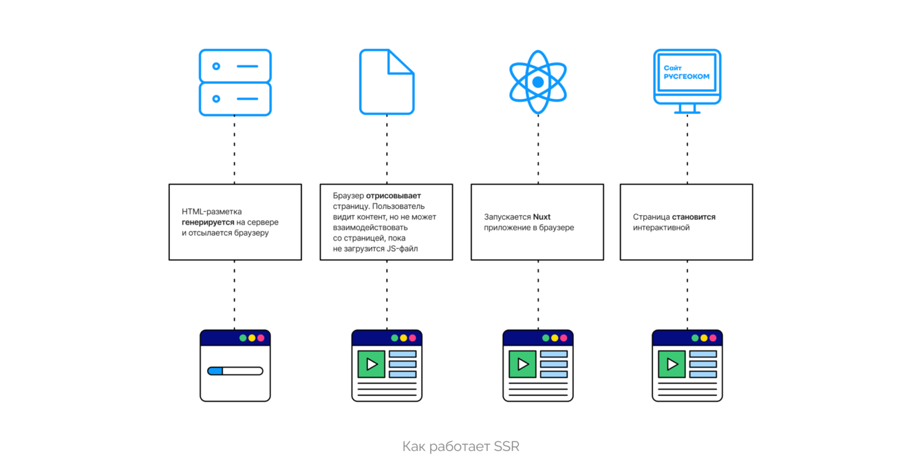 ❛❛ Когда речь идет о режиме серверного рендеринга для первого хита и клиентского рендеринга — для последующих, нужно сделать оговорку, что мы имеем в виду не совсем классический вид перехода, когда каждый переход по ссылке запрашивает страницу с сервера. Сейчас страницы генерируются в основном, в браузере пользователя, с бэкэнда приходят только данные — так работает SPA-подход. Как это работает: когда пользователь заходит на сайт, сервер отправляет код SPA-приложения, которое затем запускается и работает в его браузере. В процессе работы SPA запрашивает данные с сервера при переходе между страницами, что позволяет достичь более быстрого рендера страниц и избежать перезагрузок страниц приложения до тех пор, пока не произойдет принудительная перезагрузка, например, обновление страницы в браузере или повторный вход на сайт. Такой подход облегчает процесс разработки и улучшает пользовательский опыт.