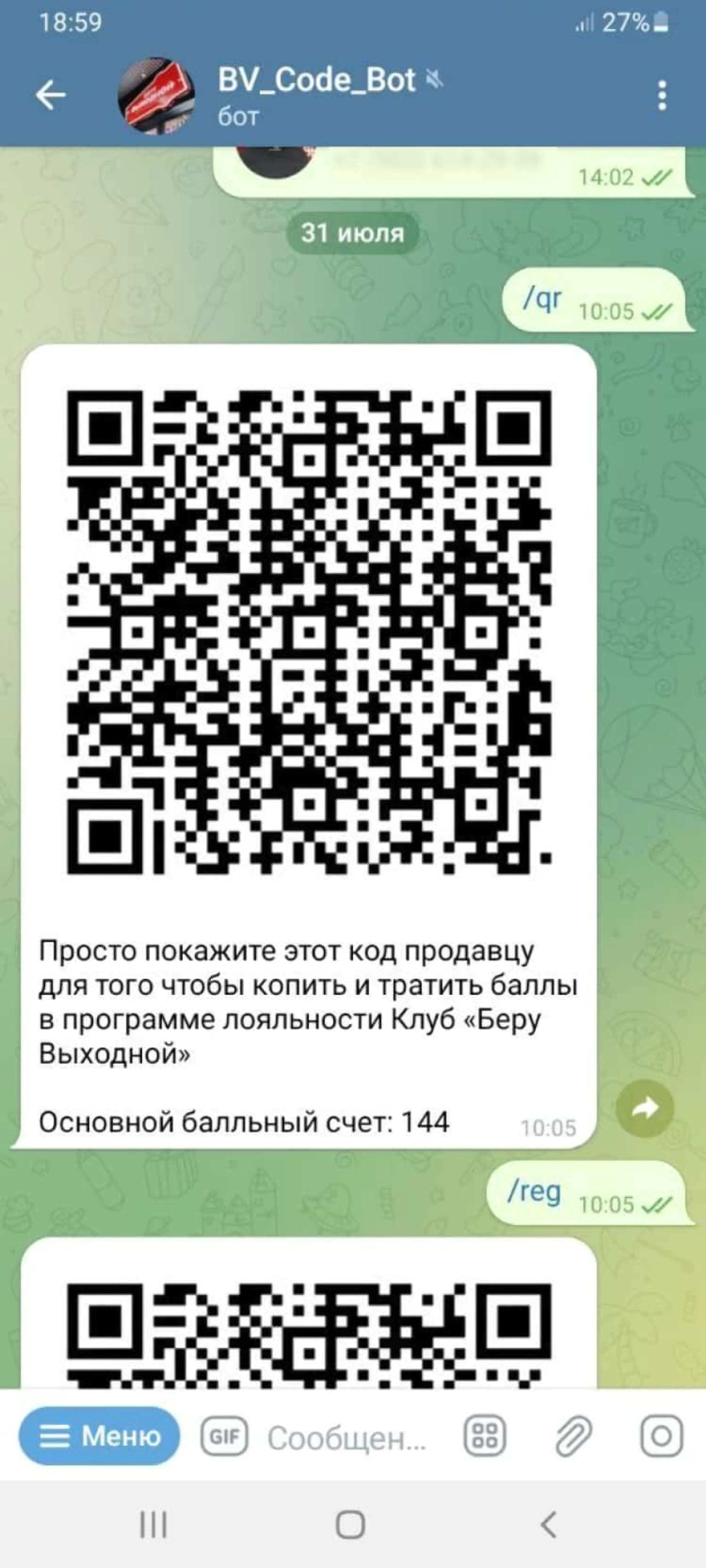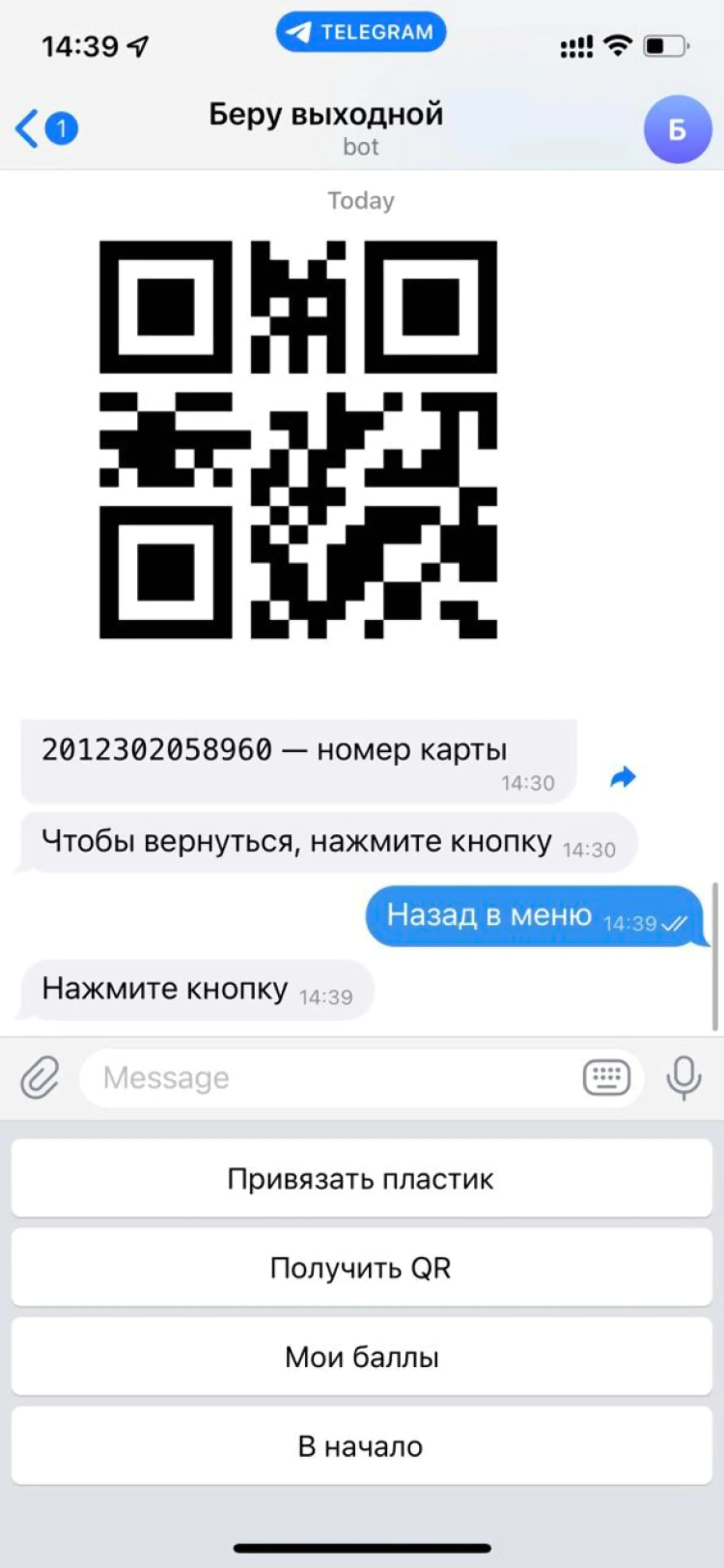 Кроме генерации QR-кода, новый чат-бот «Беру выходной» позволяет зарегистрироваться в программе лояльности и проверить баланс