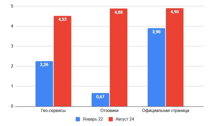 - Увеличен средний рейтинг карточек компании на ГЕО-сервисах до 4,53 (+2,27), а на сайтах-отзовиках до 4,88 (+4,21).