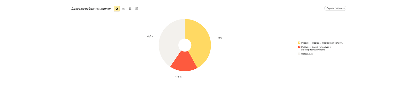 Распределение инвестиций по географии было основано на текущих данных о конверсии и доходе с каждого региона. Мы учли специфику спроса, особенности поведения потребителей и конкурентную среду в каждом из выбранных регионов.