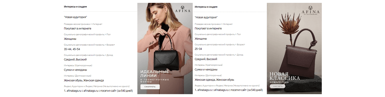 Целевой аудиторией рекламной кампании стали женщины в возрасте от 35 до 54 лет с доходом выше среднего. Также решили дополнительно протестировать более молодую аудиторию (25–34 года), так как она демонстрировала высокий потенциал для быстрых покупок и доступность средств.
