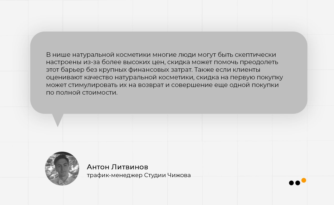 В первую очередь скидка — это «крючок», который вызывает желание потенциальных клиентов попробовать натуральную косметику, это отличная возможность расширить клиентскую базу.