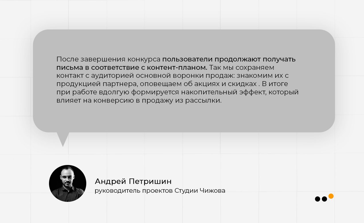 После завершения конкурса большинство пользователей остаются в рассылке, даже если не выиграли. Далее мы отдаем им промокод со скидкой 25% на первый заказ. Затем мотивируем оставаться за счет ценности рассылки: возможностью получать специальные предложения и небольшое количество полезного контента.