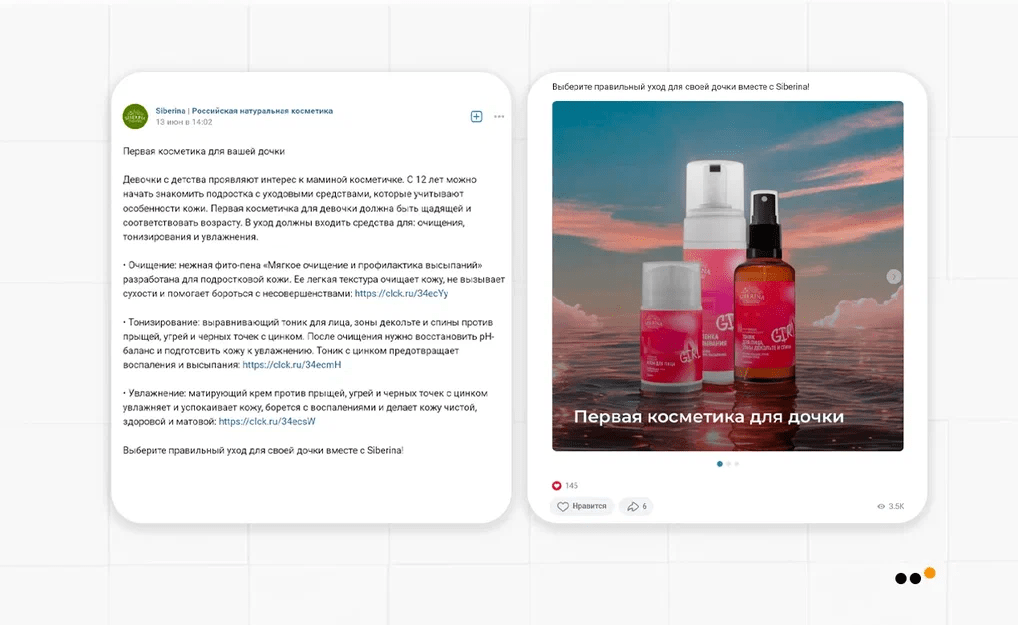Мы выражаем благодарность SIBERINA за доверие и продуктивный подход к работе. Партнеры всегда позитивно реагируют на наши предложения по коррекции стратегии, тестированию новых подходов и инструментов. Благодаря этой совместной работе удалось создать из сообщества ВК стабильный канал продаж.