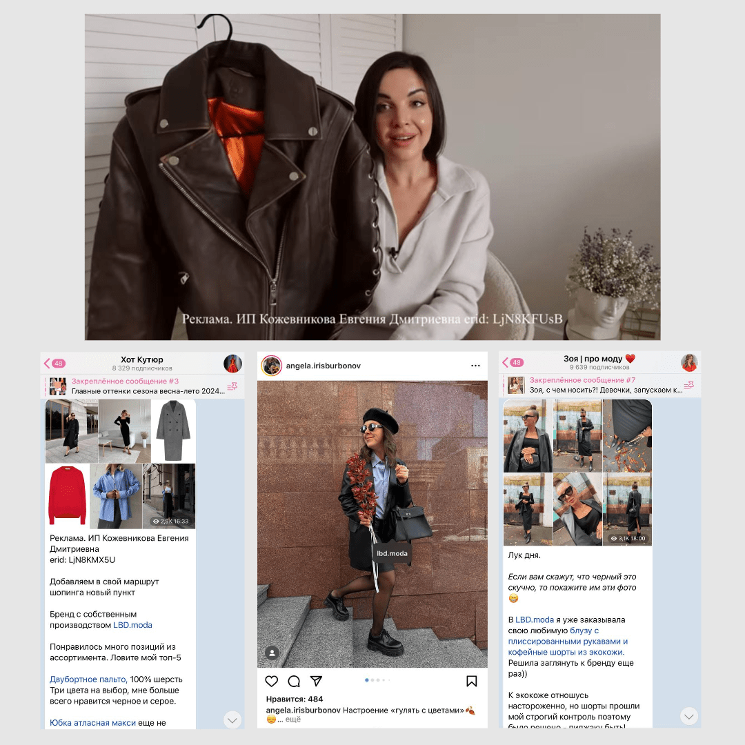 Основными площадками для работы с блогерами были Нельзаграм*, Telegram и позже включили в работу YouTube. Использовали форматы обзора в сторис (примерка и обзор изделий), телеграм-посты с подборкой фотографий с сайта, а также ролики на YouTube, где блогеры более подробно рассказывали о бренде и стилизовали образы.