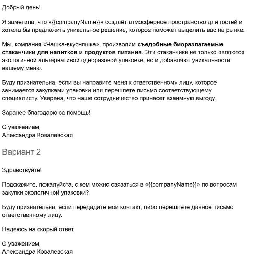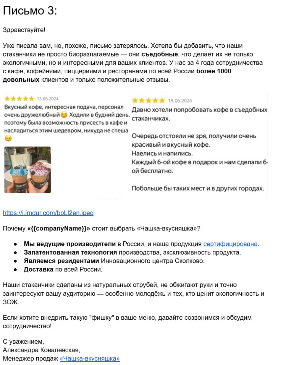 1. Не продавайте продукт, продавайте пользу. В письмах мы говорили не о стаканчиках, а о том, как они помогают привлечь гостей и снизить издержки.