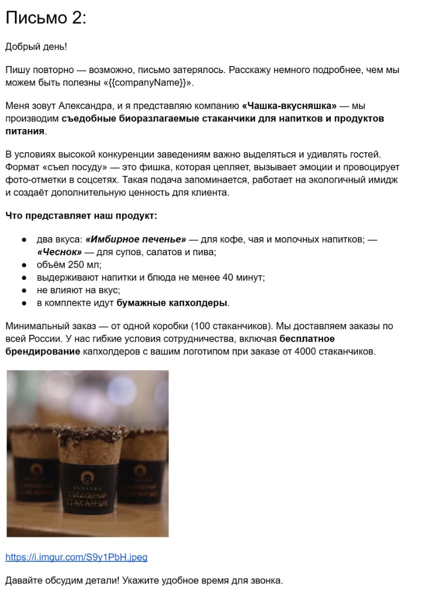 1. Не продавайте продукт, продавайте пользу. В письмах мы говорили не о стаканчиках, а о том, как они помогают привлечь гостей и снизить издержки.
