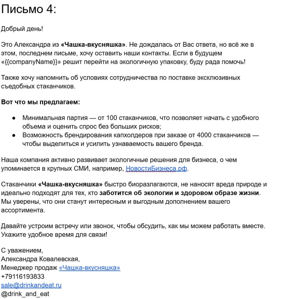 Письмо 4: финальное письмо, мягкое закрытие, оставляем контакты, упоминаем СМИ и условия брендирования капхолдеров.