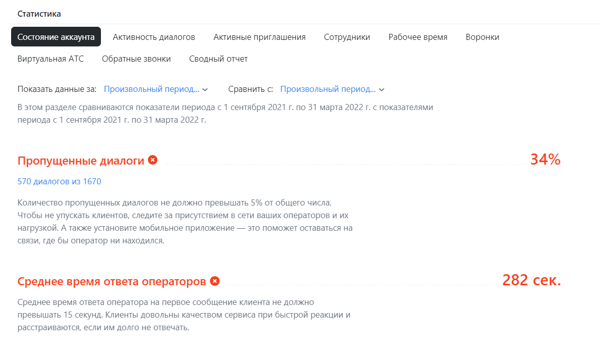 Рекомендуемое время реакции оператора на первое сообщение пользователя — 1 минута. В нашем случае, ответа приходилось ждать до 5 минут. За это время большинство заинтересовавшихся людей уходили с сайта недовольные.