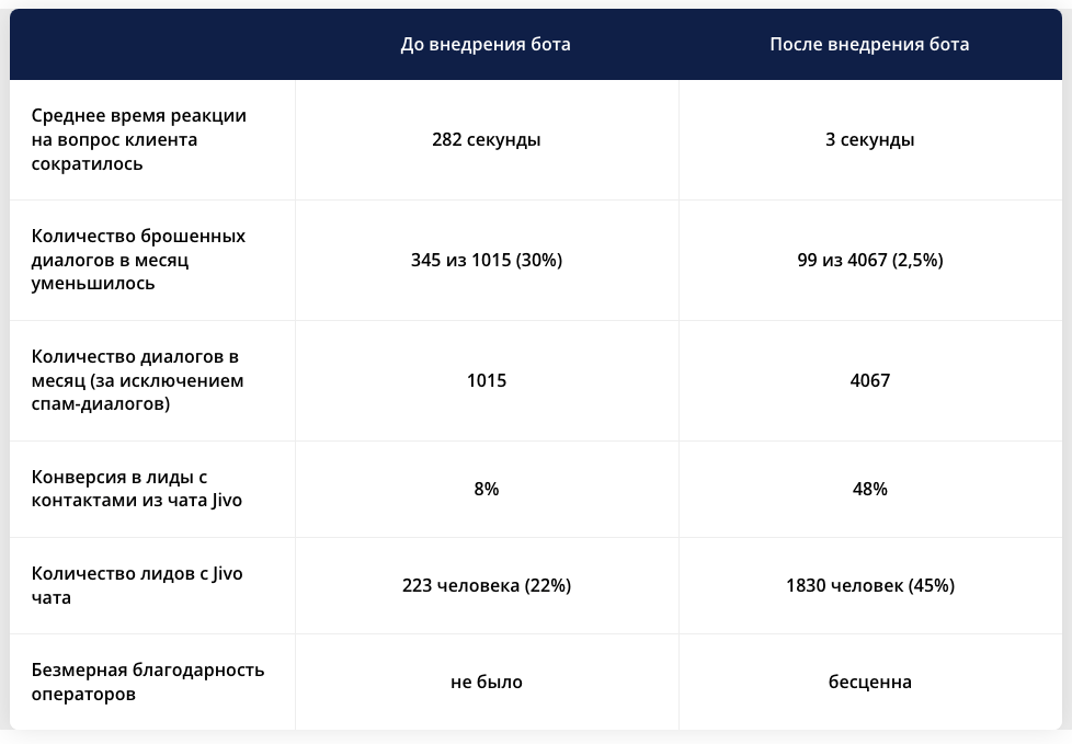 - живым операторам бот сейчас переводит только 32% от всех диалогов, что снизило нагрузку на операторов. Менеджер успевает вдумчиво ответить на все целевые запросы;