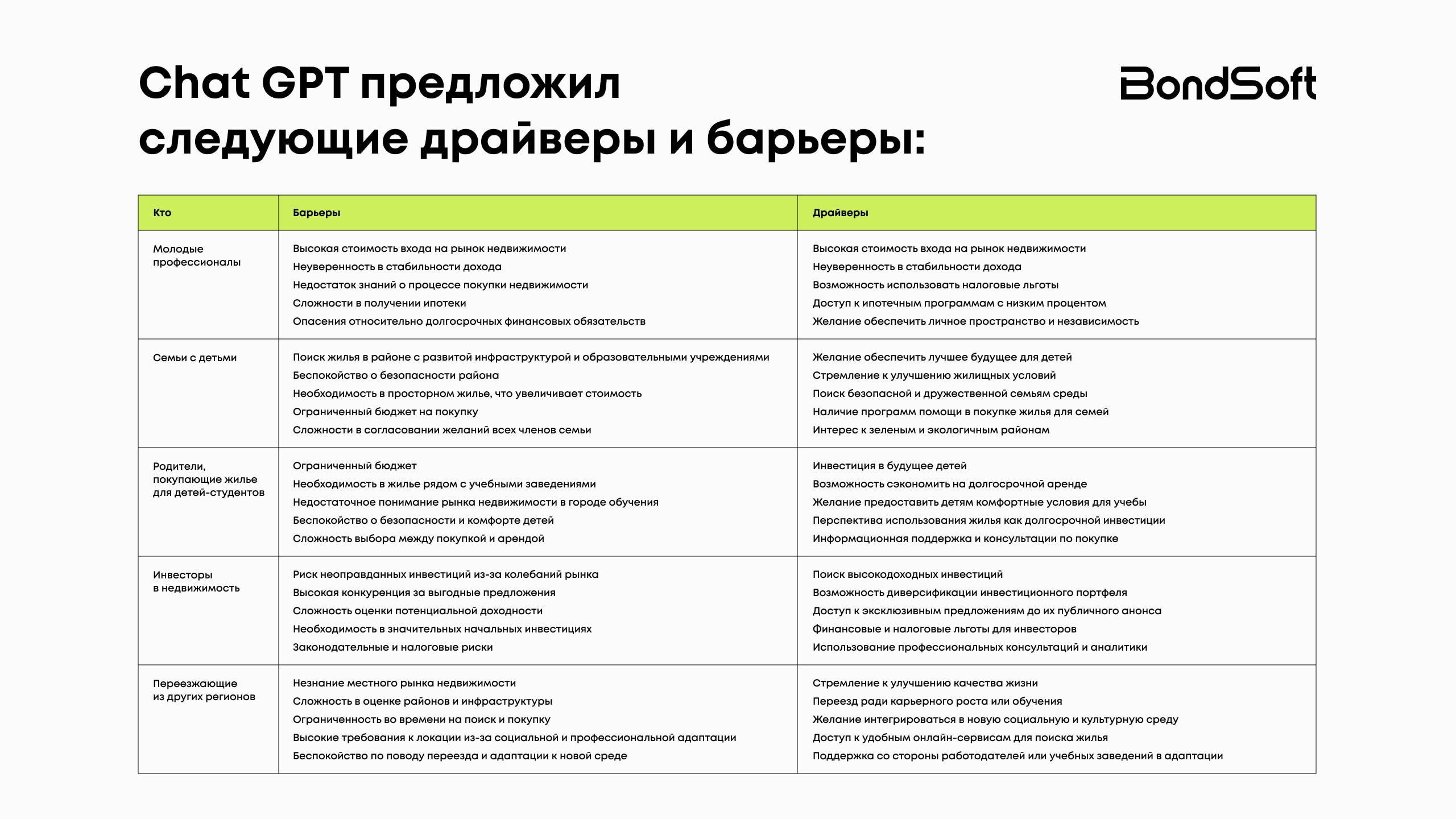 Попросили по 5 на каждый сегмент. GPT справился, но с нюансами: местами путал барьеры с особенностями, не всегда выделял реальные триггеры. Например, «поиск района с хорошей инфраструктурой» — это скорее ожидание, а не страх. Здесь пришлось доработать вручную, но основа сэкономила время.
