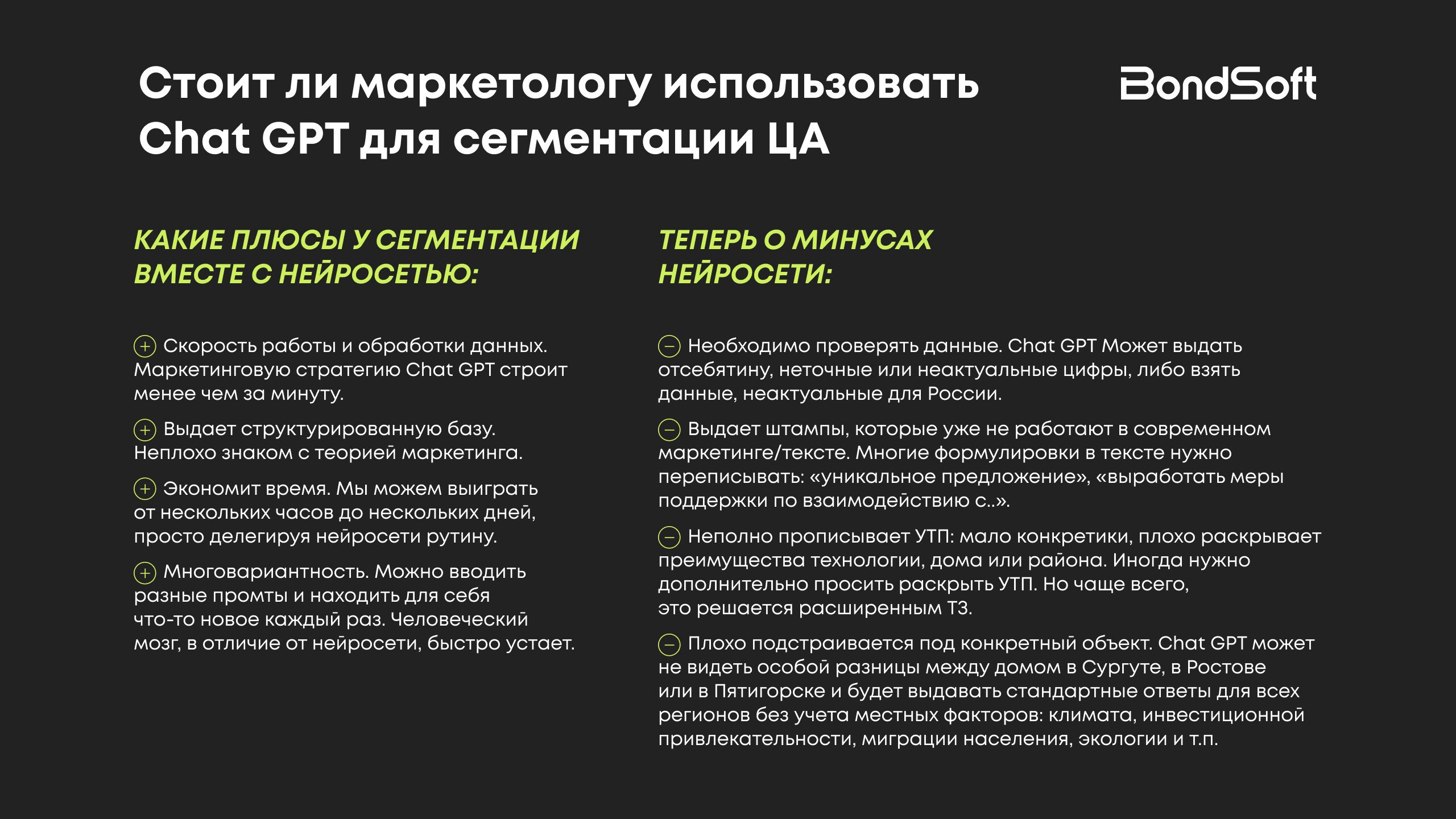 GPT 4.0 не заменяет маркетолога. Но позволяет сэкономить часы на подготовке. Даёт идеи, помогает не забыть важное, предлагает структуру, которую можно развернуть.