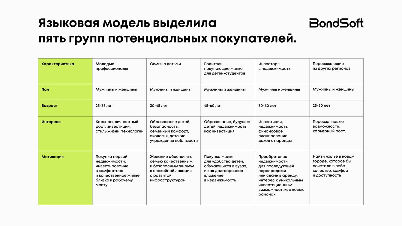 Мы дали языковой модели подробный промт и получили 5 логичных сегментов: молодые специалисты, семьи с детьми, родители студентов, инвесторы и переезжающие из других городов. Структура — понятная, описания — рабочие. Уже хорошо: экономим время на подготовку базы, которую дальше можно развивать.