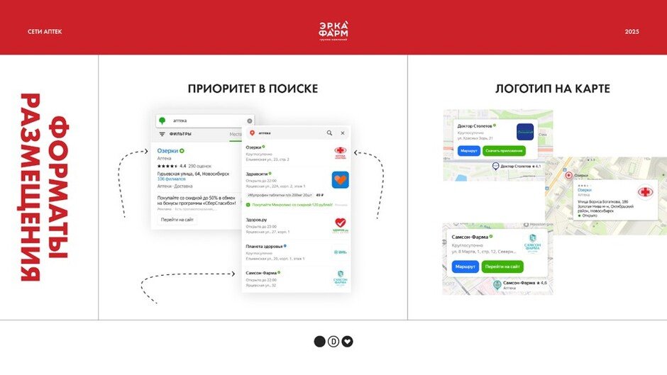 В карточках аптек позволяла пользователям видеть ассортимент прямо в интерфейсе карт. Мы акцентировали внимание на самых популярных и выгодных предложениях, что привлекало дополнительное внимание и стимулировало покупки.