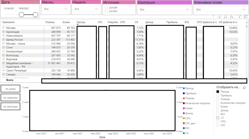 Аналитика – один из факторов эффективности. На проекте мы внедрили систему дашбордов, которые позволяют оптимизировать рекламу по реальным продажам.