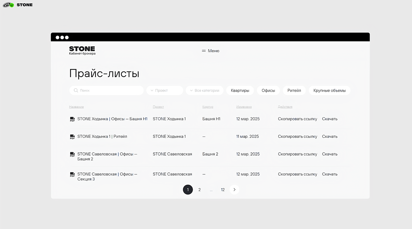 3. Перенесли все прайс-листы, рендеры, презентации в одну систему. Необходимые файлы доступны внутри ЛК: для каждой группы материалов есть своя страница со всеми данными.