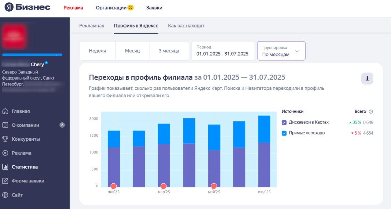 В 2025 году автомобильный рынок столкнулся с ростом рекламных затрат и нестабильным спросом на новые машины. В таких условиях дилеру Chery в Санкт-Петербурге требовался инструмент, способный одновременно усиливать узнаваемость и приводить реальных покупателей в салон. В качестве решения был выбран формат продвижения через Яндекс Бизнес с фокусом на Яндекс Карты и Навигатор.