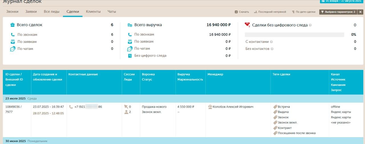 Аудитория, приходящая через Яндекс Карты, находится ближе к принятию решения: пользователь уже выбирает точку посещения, а не просто изучает информацию. Это подтверждается высокой конверсией визитов в сделки — 66%.