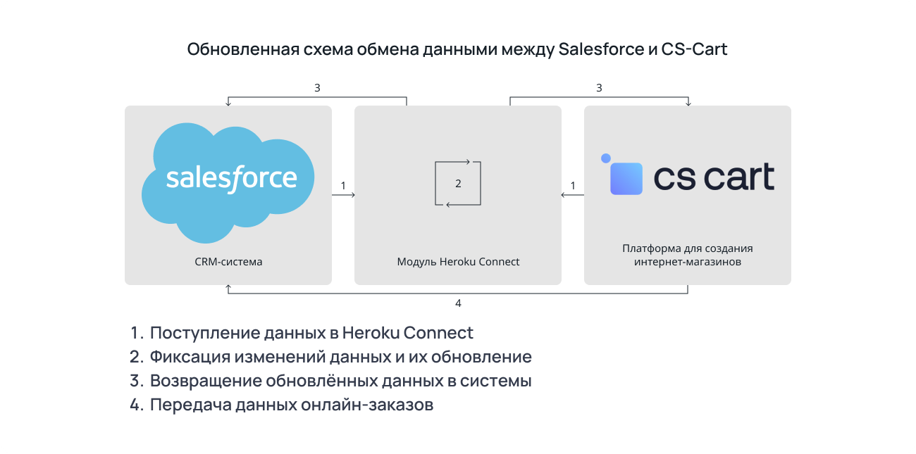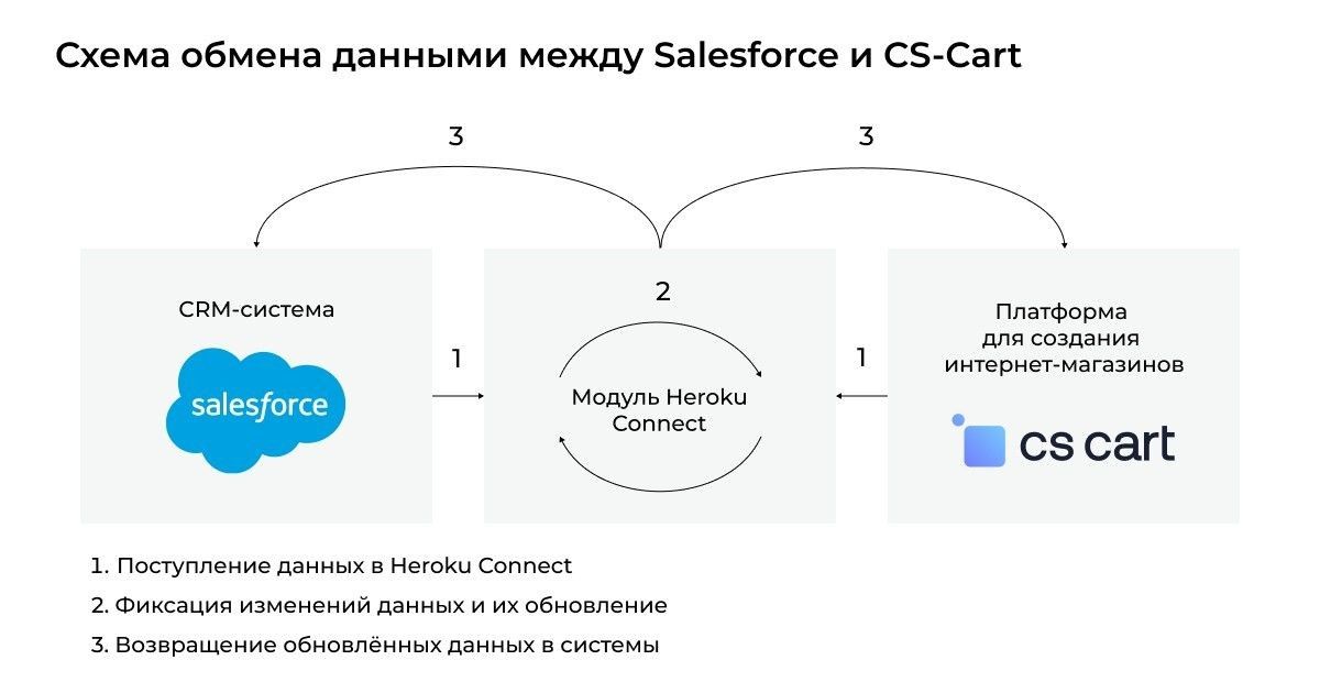 Для заказчика было важно сохранить работу с Salesforce и использовать её в качестве единой информационной базы. И чтобы достичь этой цели, нам понадобилось синхронизировать данные Salesforce и CS-Cart.