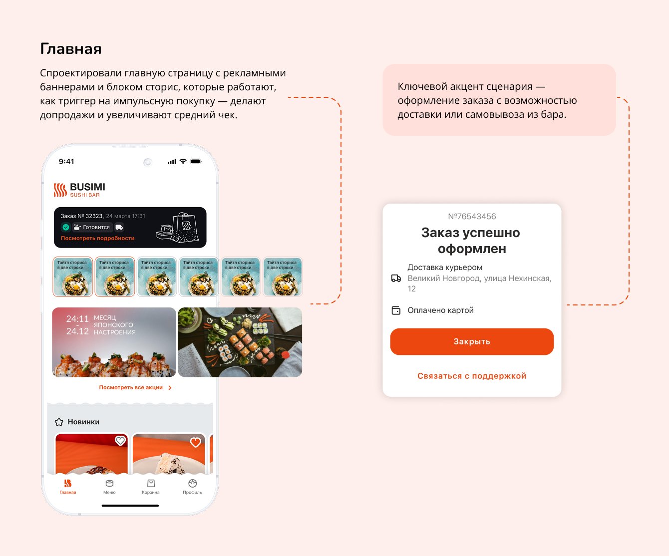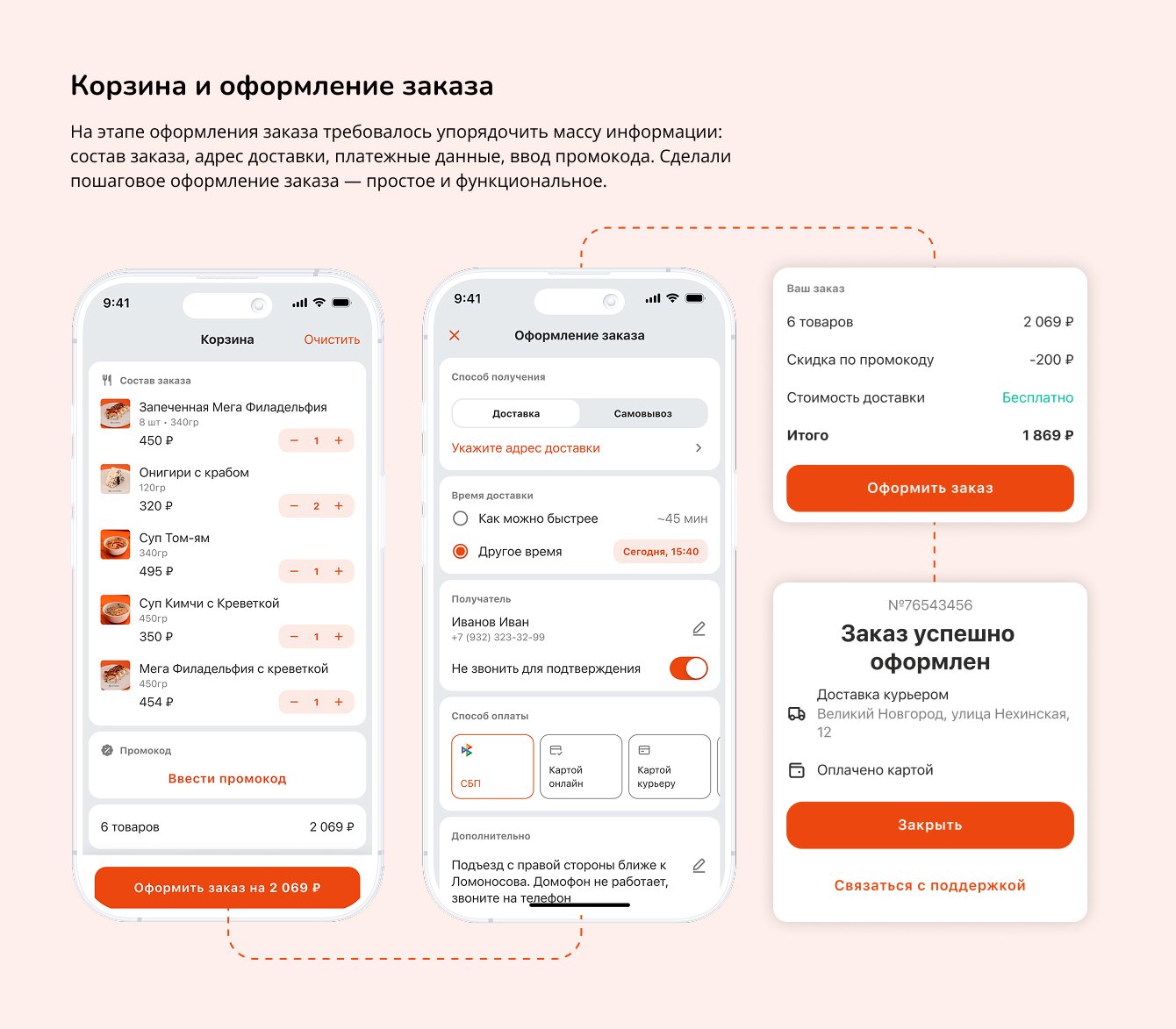 Сделали акцент на быстром оформлении заказа с вариантами выбора получения — курьером или через самовывоз из суши-баров.
