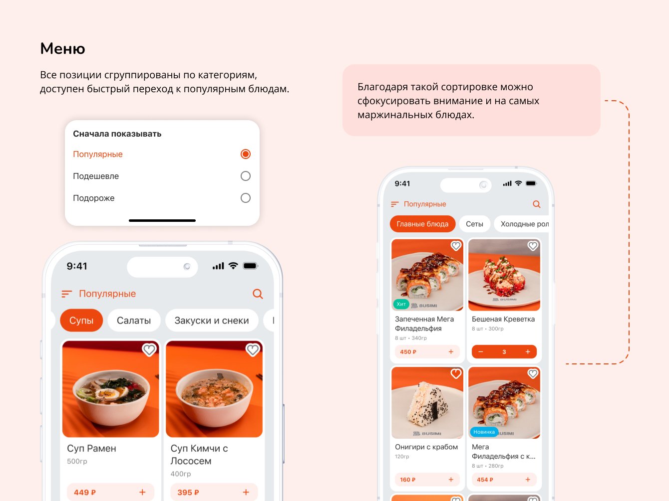 Благодаря таким моментам пользователь тратит меньше времени на поиск блюд, быстрее принимает решение о покупке, а компания получает больше завершенных заказов.