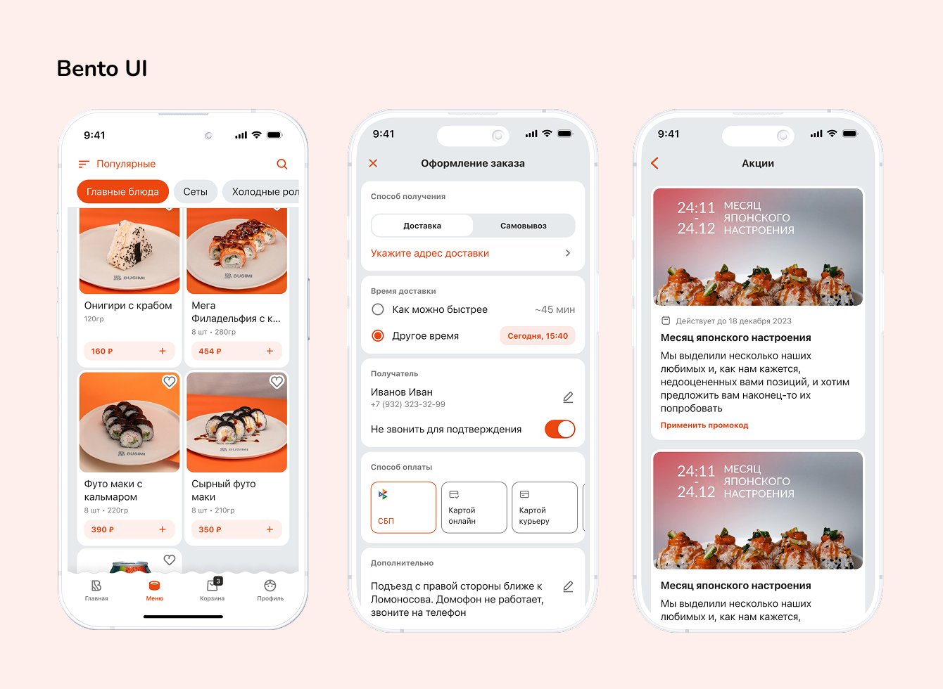 Для дизайна выбрали современный стиль bento UI с его модульной сеткой, плавными линиями и карточной подачей. Его структурность хорошо перекликается с японской эстетикой, а карточная система упрощает навигацию. Интерфейс получился выразительным и удобным, как для клиентов, так и для бизнеса.