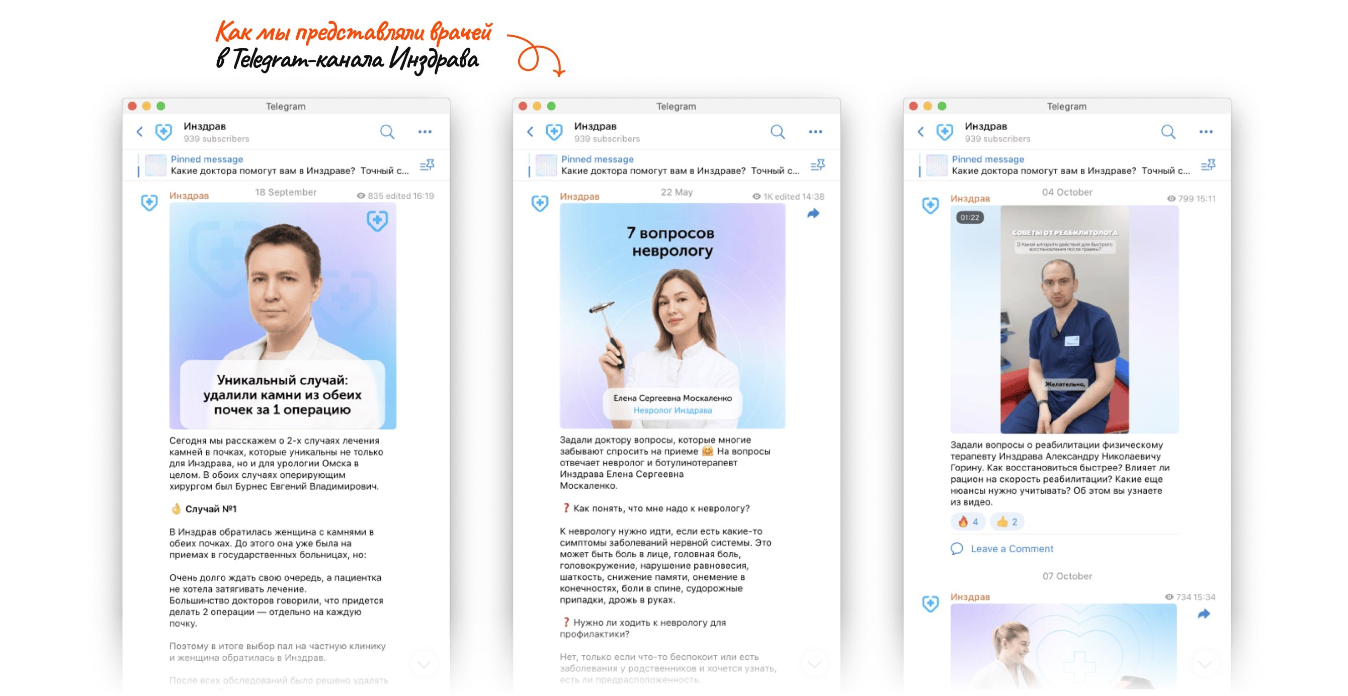 Мы понимали, что так всех распугаем и отказались, а решение аргументировали так: «Представьте, что человек, которому нужна имплантация сустава увидит, как другого пациента в реальности оперируют со всеми подробностями — он же сразу ассоциирует себя с ним. Подумает “ну его нафиг, буду ходить на болеутоляющих и с тросточкой дальше”. Поэтому лучше представлять докторов через достижения, кейсы, формат “вопрос-ответ” и советы».