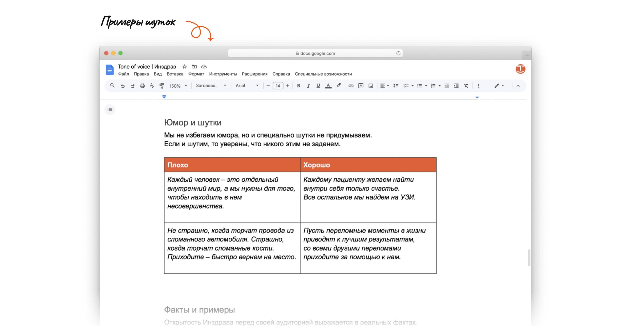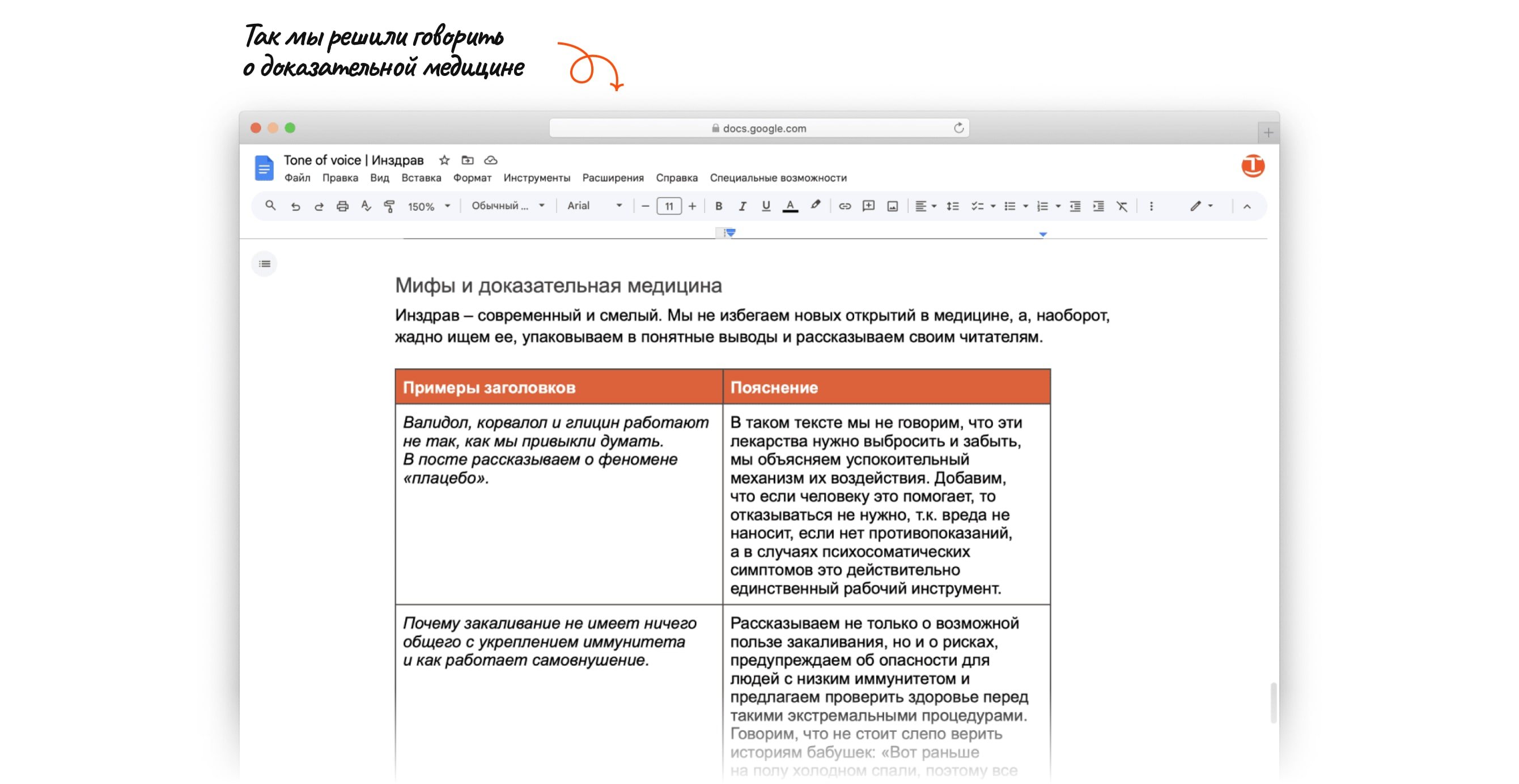 Сделали документ с ToV лаконичным и понятным. Для сравнения: в Т-Ж это 70 страниц, а в Инздраве — 8. Выбрали такой формат, потому что на ToV должны были ориентироваться не только копирайтеры, но и дизайнеры с докторами. Например, сейчас его используют доктора, когда готовятся к интервью или дают комментарии в СМИ.