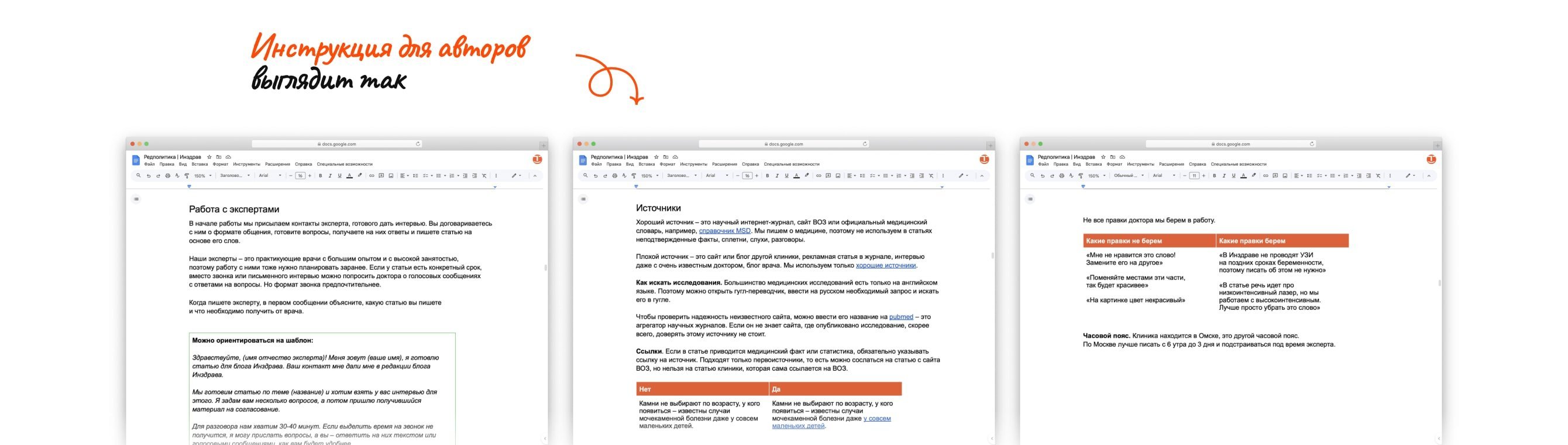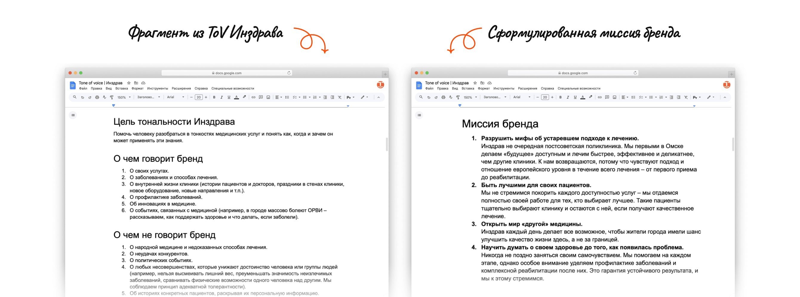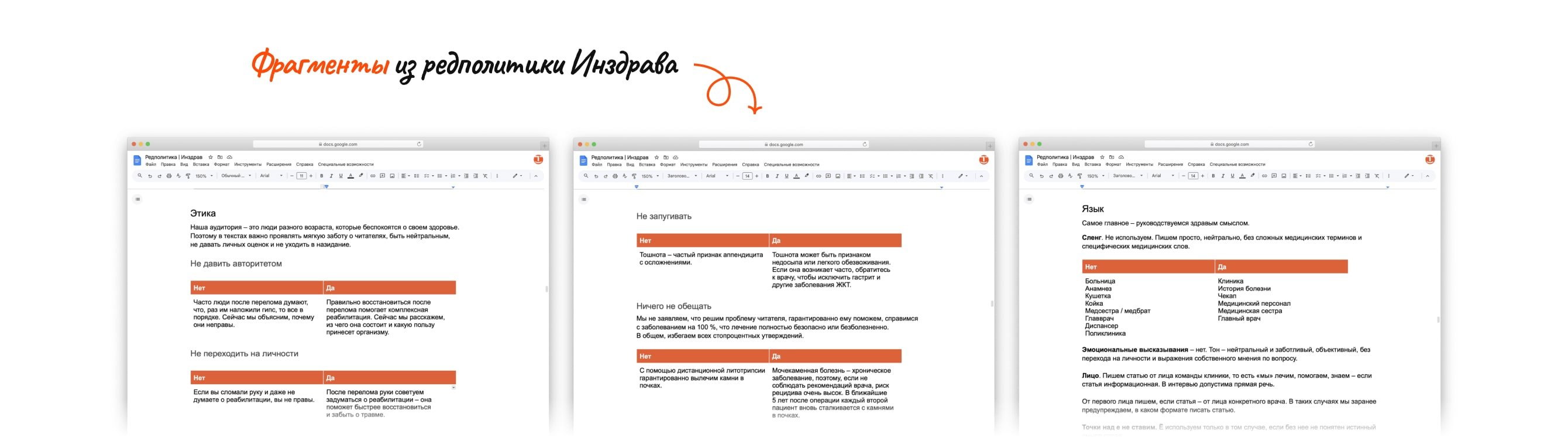 Когда они получили готовые документы, у них в голове сложилась цельная картинка. Стало ясно, почему наши тексты не похожи на классический контент большинства медицинских учреждений.