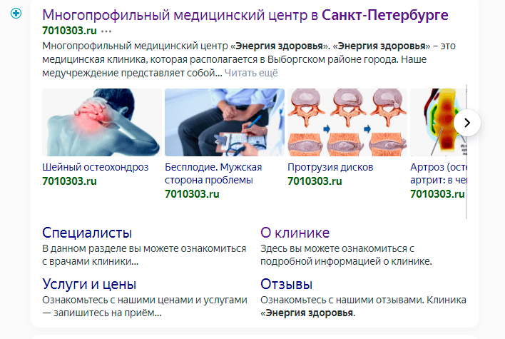 Цель – улучшить сниппет в поисковой выдаче. В описание сайта (сниппет) добавляется карусель из статей, что делает блок с информацией о сайте более заметным и привлекательным. Это позволяет привлечь больше потенциальных пациентов на сайт клиники.
