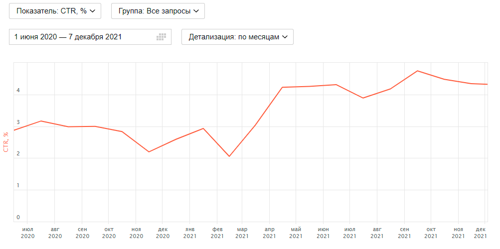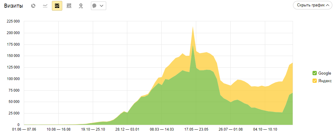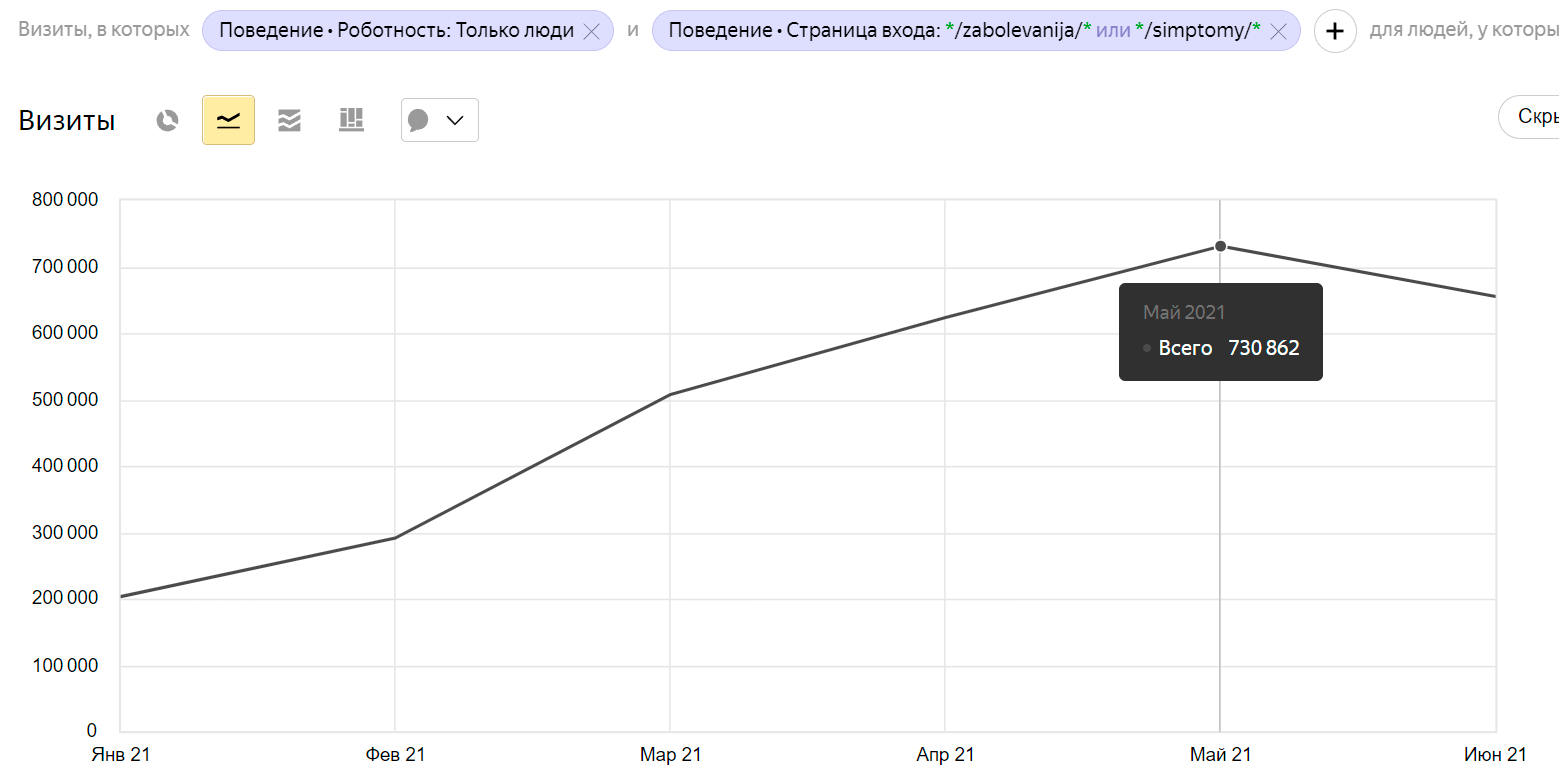 Такой контент быстро понравился поисковым системам и сразу начал высоко ранжироваться. Страницы имели хорошие поведенческие метрики, что привело к кратному росту трафика и достижению абсолютного максимума в 730 000 визитов из поиска в мае 2021 года.