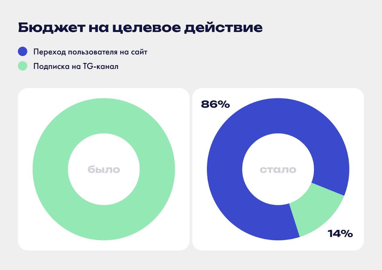 Несмотря на то, что новые подписчики обходились дорого, они были нужны каналу. Поэтому мы решили оставить эту цель, но значительную часть бюджета (86 %) отдать другой: “Переводу пользователя на сайт”, где тот мог познакомиться с отелем, его атмосферой, инфраструктурой, номерами, ценами и совершить бронирование.