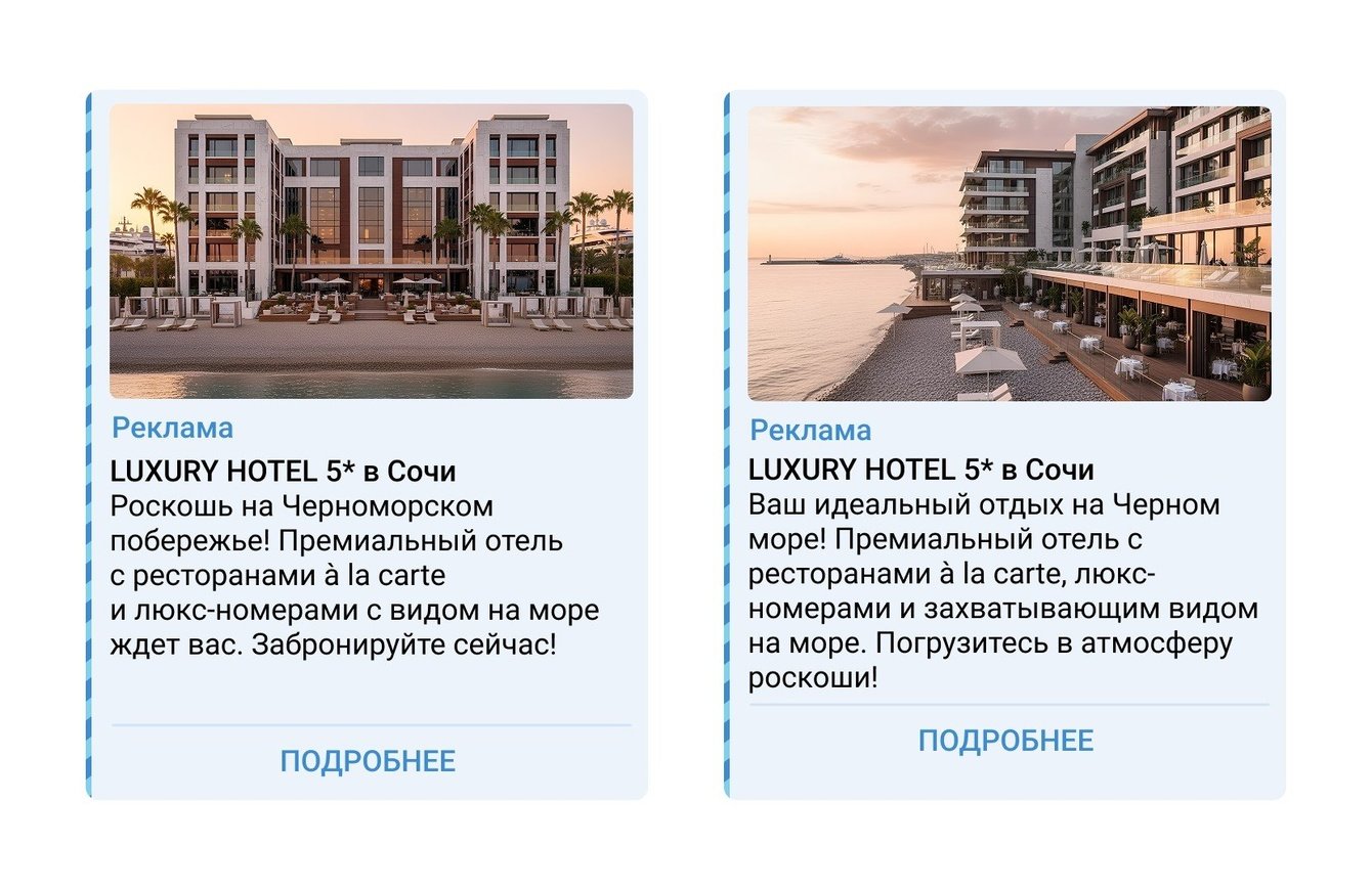 При выборе каналов для рекламы отеля казалось логичным сосредоточиться на сообществах о путешествиях и отдыхе. Однако мы обнаружили, что большинство таких каналов ориентированы на массового туриста: горящие туры, скидки, акции на выходные. Их аудитория не готова к ценам luxury-отеля.
