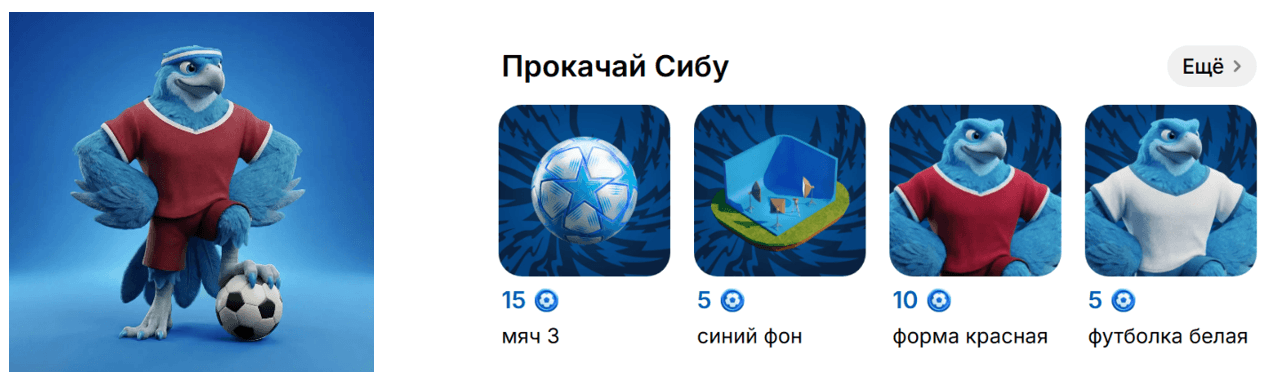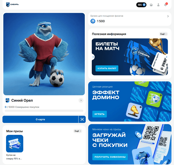 Маскот. Центральным персонажем программы стал орёл по имени Сиба. Живой, заводной и слегка озорной — он сопровождает болельщиков к их победам, подсказывает в выполнении заданий и искренне радуется каждому новому успеху. Ключевой задачей было превратить его в героя, с которым хочется взаимодействовать. Именно поэтому в программу заложили механику развития Сибы: за заработанные сибкоины фанаты приобретают для него предметы гардероба и экипировки — кепки, шапки, футболки, форму. Получился своего рода «симулятор болельщика», где твой виртуальный персонаж прогрессирует вместе с тобой.