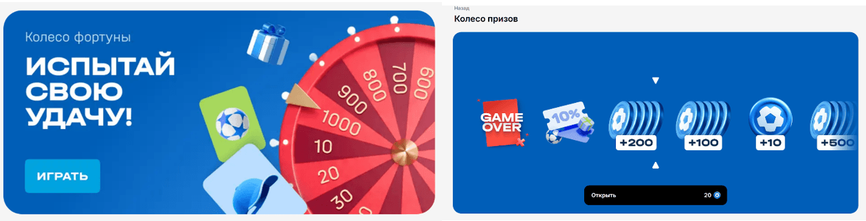 • Играть — вращать «Колесо фортуны», открывать парные ячейки в мини-игре «Цепная реакция» или проходить тематические квизы от футбольного клуба.