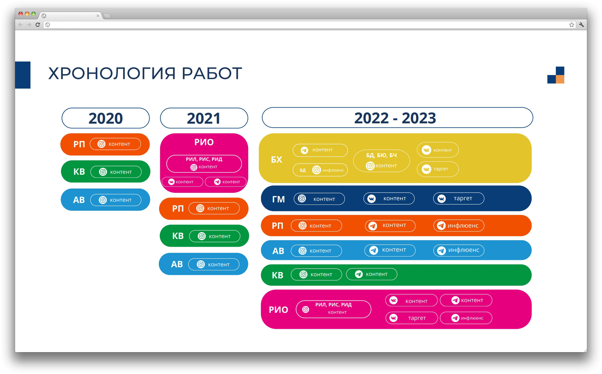 Команда организовала работу так, что заказчик выбрал нас в качестве одного партнёра по контенту. Если в 2020 мы создавали контент для трёх соцсетей, в 2023 году их было уже шесть.