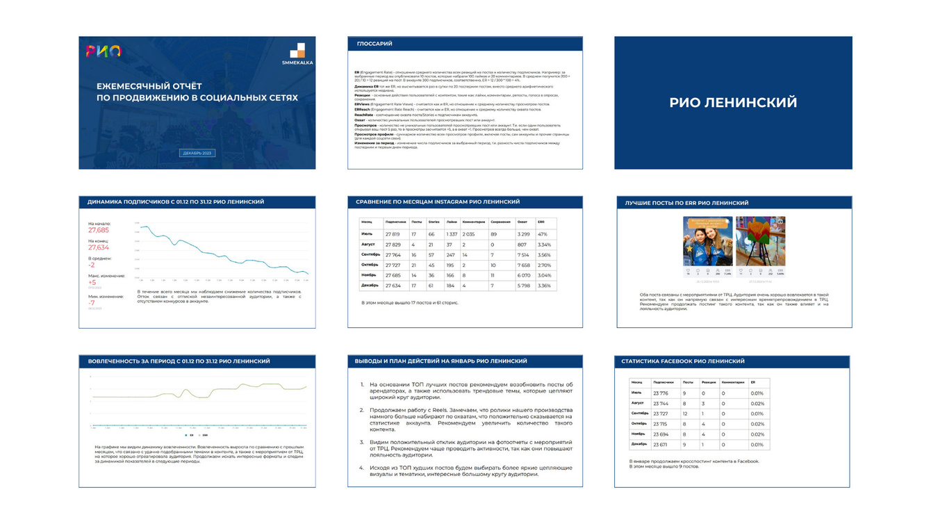 По завершении отчётного периода в течение 3 рабочих дней мы готовили отчёт за прошедший месяц. Он включал в себя: объём выполненных работ отчет по каждой соц.сети (динамика подписчиков, охватов, вовлеченности, лучшие и худшие посты по ERR и их анализ, выводы и план действий) отчёт по комьюнити-менеджменту.
