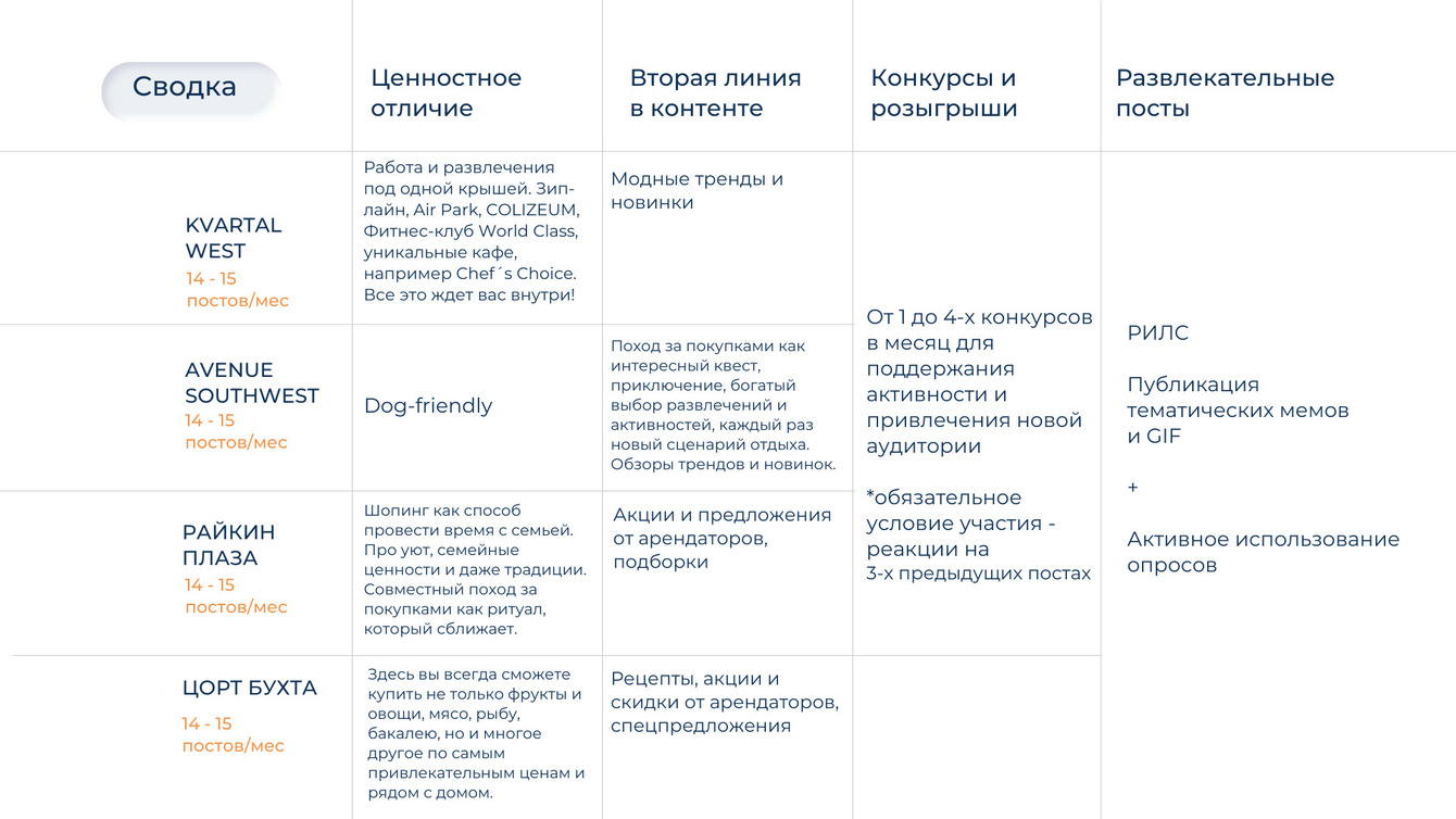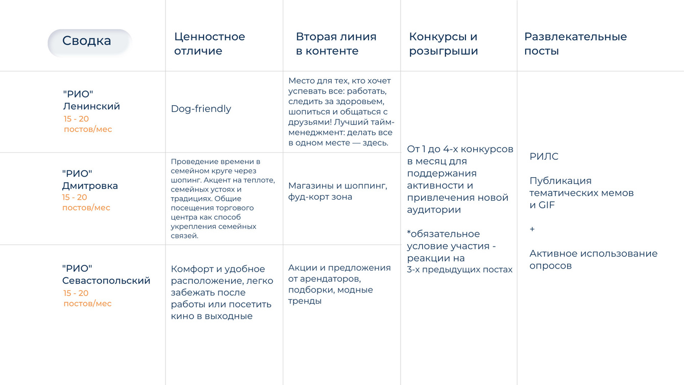 Каждый торговый центр имеет своё позиционирование: исходя из этого мы формируем контент-стратегию