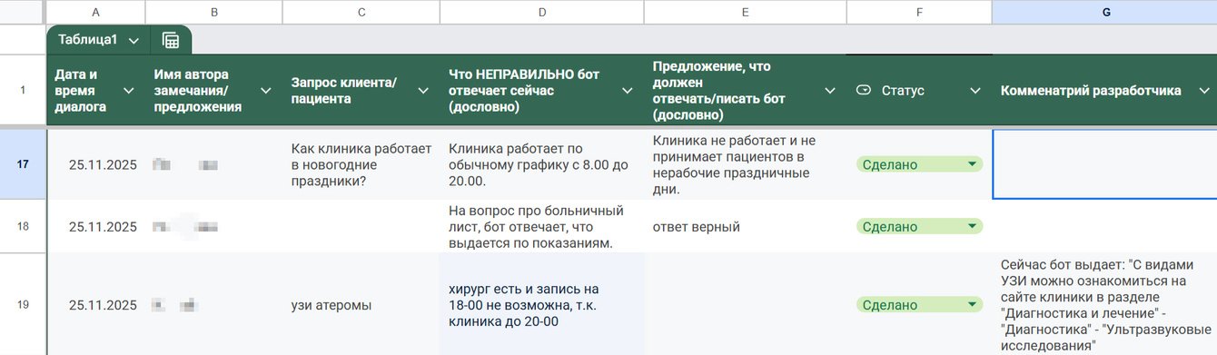 Примеры доработок: Для отладки работы бота была создана специальная Google-таблица обратной связи , где сотрудники клиники записывали замечания по боту. Разработчик устранял ошибки, переписывал неудачные ответы, дополнял FAQ.