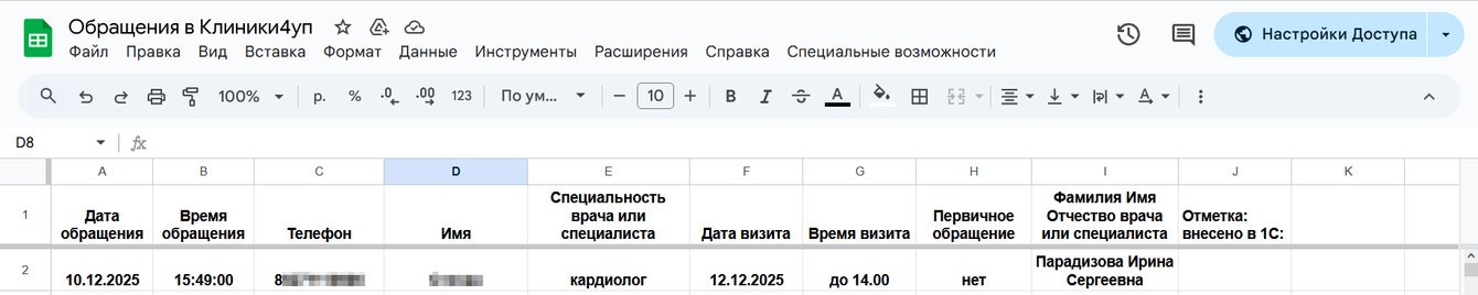 Все данные из диалогов автоматически записываются в Google-таблицу, к которой имеют доступ руководство и администраторы клиники. В таблице сохраняется информация: