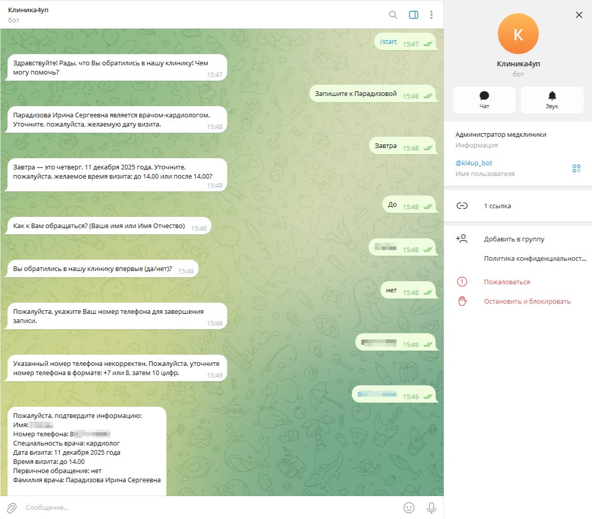 • Ловили ошибки: неправильные ответы ИИ-бота, забытые поля для записи на визит к врачу.