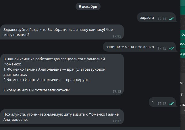 Благодаря проработанной инструкции, обучению по предоставленной заказчиком информации и тщательной отладке ИИ-сотрудник легко справляется с нешаблонными ситуациями. Например, когда одной фамилии врача недостаточно для идентификации специалиста: